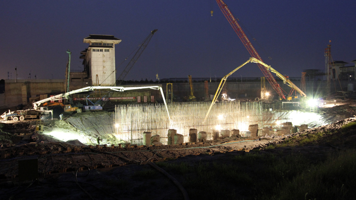 江苏水建人的精神在此刻得到了充分的展示。项目部没有丝毫气馁,迎难而上。增加人员、设备资源投入,调整优化现场作业方案,细排工期到每一天的每一个时点。大家成天成夜地泡在工地上组织施工作业,无论是大雨如注,还是夜幕降临,工地上总会见到他们的身影。老钢筋队长黄伯健同志,跟班指导工人绑扎钢筋,连续几天通宵作业,3天就完成了160吨的钢筋施工任务,而黄伯健同志也累倒了。新来的几个大学生,尽管刚刚走上工作岗位,但小伙子们肯学肯钻肯吃苦,很快的适应了高强度的工地生活,进步很大。