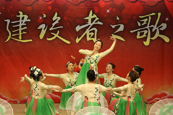 联欢会上,全省水利工程建设者自编自演,表演了歌舞、合唱、音诗画、京剧、说唱、器乐、小品等丰富多彩的文艺节目。我公司9名女职工表演了器乐舞蹈《水乡丽影》,成为联欢会上一道独特的风景线。在琴音缭绕的古筝伴奏下,水乡丽人们翩翩起舞,婀娜多姿,清新脱俗,展开了一幅江南水乡人水和谐的画面,引得台下观众掌声连连。大家连声惊叹,没想到一直在钢筋混凝土中摸爬滚打的水建人,也能跳出如此柔美、秀丽、高雅的舞蹈!