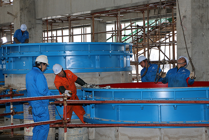 201812月下旬首台水泵进场以来,安装队伍精心组织施工,倒排工期攻坚克难,一直到腊月三十和正月初一还在工地接卸到工机泵,初三就全员到岗进入到紧张、快节奏地安装进程中,全员加班满负荷施工。