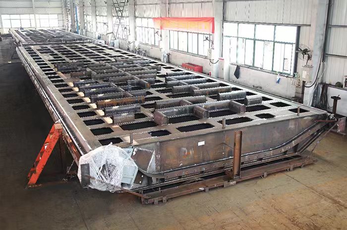 平寨航电枢纽是清水江干流革东以上干流梯级的第9级电站,工程总体布置从左至右分为船闸、溢流坝和发电厂房三部分,船闸布置在枢纽左侧,级别为Ⅳ级500t单线单级船闸。此次水机公司承制的人字门共2扇,高26m、水头23.832m、重约380t,在胎模上整体制造,分节(18片)运输。