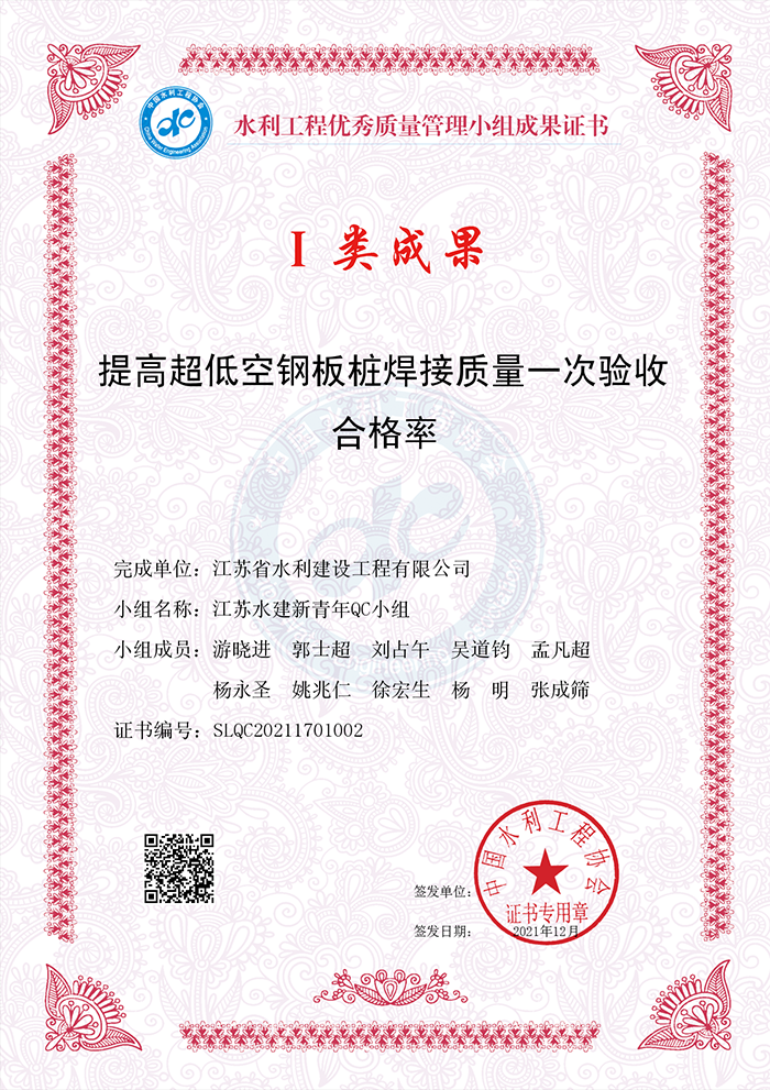 1127 日,中国水利工程协会公布了2021年度水利工程优秀质量管理小组成果,公司参加发布的5QC课题获评优秀质量管理成果奖,其中I类成果1项,II类成果4项。第三工程分公司江苏水建新青年QC小组现场型QC成果《提高超低空钢板桩焊接质量一次验收合格率》荣获I类成果。