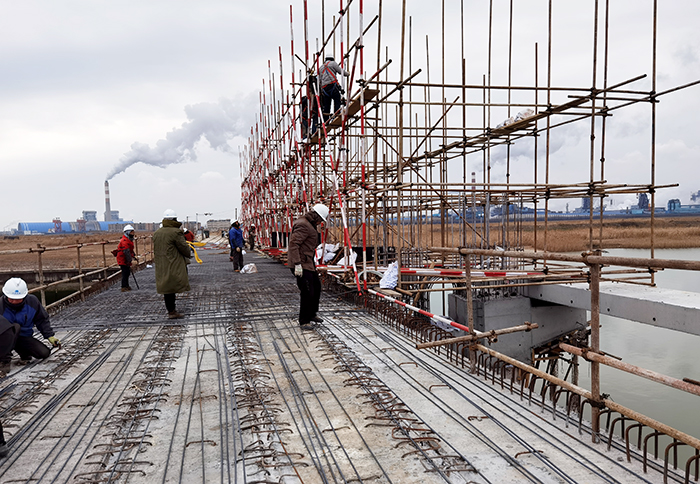 28日,新沂河海口枢纽南、北深泓闸除险加固工程项目寒风刺骨,项目部管理人员、木工队、钢筋队、水石队50余人全部进场,投入紧张有序的施工。项目已完成工作便桥吊装、闸门的吊装转运、交通桥桥面铺装层钢筋绑扎、排架施工脚手架搭设、工作桥预制钢筋绑扎及立模等。