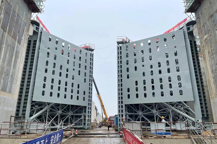 庐江船闸是在菜子湖与巢湖分水岭上建设的控制性枢纽工程,可满足引江济巢段菜巢线工程引水、通航、防洪等需要,是“引江济淮”关键性节点工程。船闸闸室长240米,宽23米,高16.95米,按Ⅲ级船闸标准建设,设计船舶吨级为1000t级,兼顾2000t船舶。船闸金属结构主要由三角闸门、闸首检修门、输水阀门、浮式系船柱、门槽埋件及启闭设备等组成。