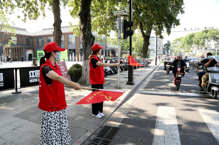 在岗点红绿灯下,身穿红马甲、佩戴小红帽、挥舞文明交通小红旗的水建志愿者正疏导行人和机动车安全通过路口,协助交警维持路口交通秩序。