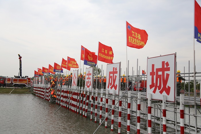 本次演练模拟受上中游来水和本地降雨叠加影响,长江南京高潮位达到警戒水位,并将持续上涨且维持较长一段时间。堤防出现渗漏、管涌、滑坡等险情,并有房屋被淹、人员被困、危化品掉落等险情。公司突击队承担决口封堵演练科目。参演人员接到命令后,立即奔赴现场开展抢险作业,植入木桩搭设脚手架、搬运沙袋封堵决口……迅速筑起了一道钢木土石组合坝,成功封堵决口,顺利完成演练任务。