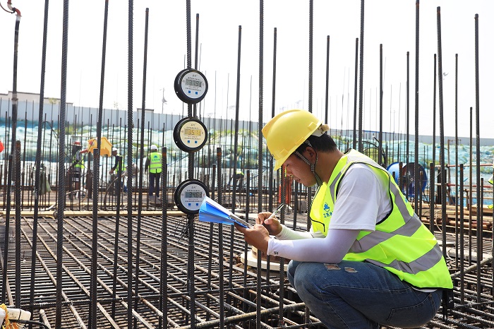 此次流道层浇筑正值高温天气,当日最高温度达37℃,浇筑过程中,值班人员严格按照浇筑方案及技术交底内容控制浇筑顺序,记录各墩墙每坯砼浇筑厚度及时间,保证在下层砼初凝前上层砼已覆盖上,避免砼冷缝。同时,安全技术人员全程值班巡视,严把安全关;试验人员严守施工规范,对混凝土的坍落度、含气量等进行详细检查,严格控制混凝土原材料质量。为防止工人中暑,项目部在施工现场备足人丹、藿香正气水、大麦茶等防暑降温用品,在浇筑仓面布置鼓风机,并安排浇筑振捣工人轮流休息,