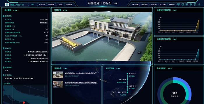 新桃花港江边枢纽工程利用互联网+技术打造的“智慧工地”平台,通过云计算、大数据、移动互联网及人工智能等前沿科技,实现了视频监控、劳务实名制管理、人员安全帽定位、扬尘噪音监控、危大工程监测、车辆冲洗监测等诸多智慧功能,提升了工地智能化管理水平。