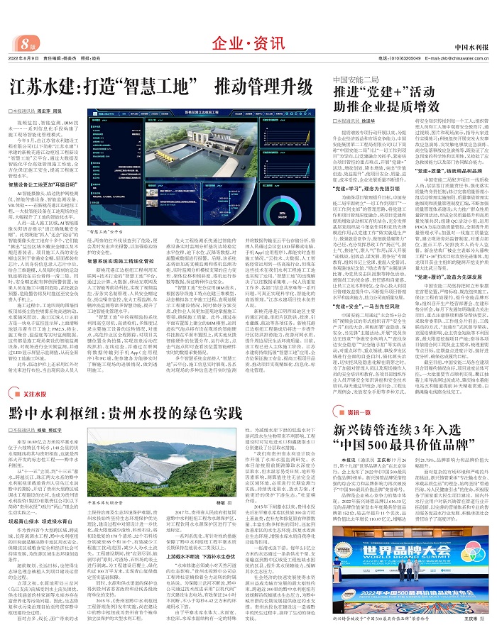 8月9日,《中国水利报》8版刊发《江苏水建:打造“智慧工地” 推动管理升级》文章,宣传报道公司新桃花港“智慧工地”建设。