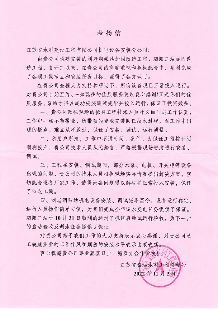 11月2日,江苏省骆运水利工程管理处发来《表扬信》,对机安分公司承建的刘老涧泵站加固改造工程、泗阳二站加固改造工程顺利完成工期节点和安装任务目标给予高度评价,表扬了公司安装技术人员特别是叶文丽同志的出色表现,向公司表示感谢和祝愿。