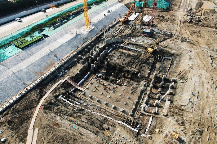 本次土方开挖于10月21日正式开始,在前期的基坑围护、降水、基础处理等施工中,项目部克服施工场地狭小、降水效果差、预制方桩施打困难、桩型多、交叉作业多等一系列问题,通过精密组织、科学施工,目前已完成预定目标,正式进入泵站底板施工阶段。