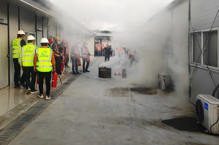 火灾应急演练模拟项目部员工宿舍发生火灾,项目部消防队在总指挥的统筹指挥下开展救援,应急疏散组紧急疏散生活区职工并将伤者搀扶到安全地带,医疗组对伤员进行简单处理后运送至医院接受进一步治疗,灭火抢险组使用灭火器灭火经过大家的通力合作,火情迅速得到控制,受伤人员也得到了有效的医疗救治,演练取得圆满成功。随后,项目部组织人员在安全地带轮流使用灭火器扑灭明火,增强施工人员使用灭火器的能力。