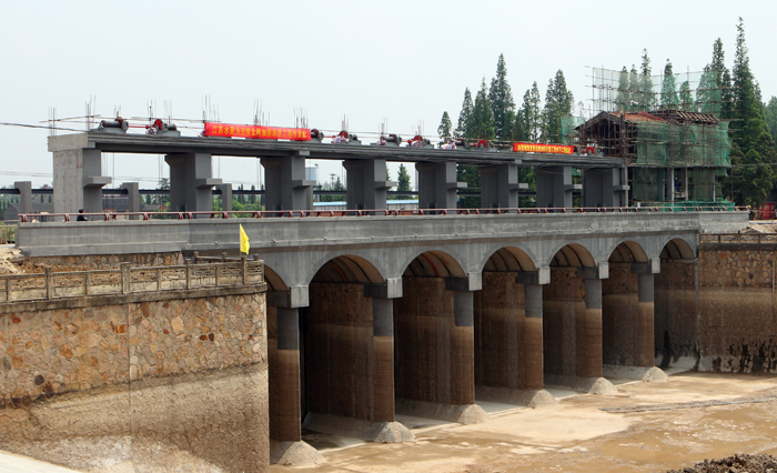 宜陵北闸位于江都宜陵镇北三阳河与新通扬运河的交汇处,是里下河地区引排主要控制建筑物。主要功能为向里下河水网供水,排涝,拦截三阳河来草,减轻江都东闸清污机的捞草压力。该闸建于1975年,设计流量300m3/s,共7孔。20075月省水利厅组织的安全鉴定结论认为:该闸建成运行30余年,现状存在工程结构老化,底板、闸墩、工作桥排架强度不满足抗震要求,公路桥设计标准低、砼闸门裂缝漏水、电气设备老化、管理设施陈旧等问题。为消除工程安全隐患,确保工程运行,对宜陵北闸进行除险加固。本次加固改造施工主要对底板及闸墩加固、胸墙拆建、增设撑梁、工作门门槽改造、公路桥拆建、工作便桥整修、工作桥及排架拆建、混凝土防碳化处理、上下游护坡整修、增设三阳河侧拦污设施、起吊排架更换闸门启闭机、新增检修闸门、门槽埋件更新改造、活动门挡更换、拦污栅改建、新作支挡结构埋件;桥头堡拆除,新建桥头堡基础等。