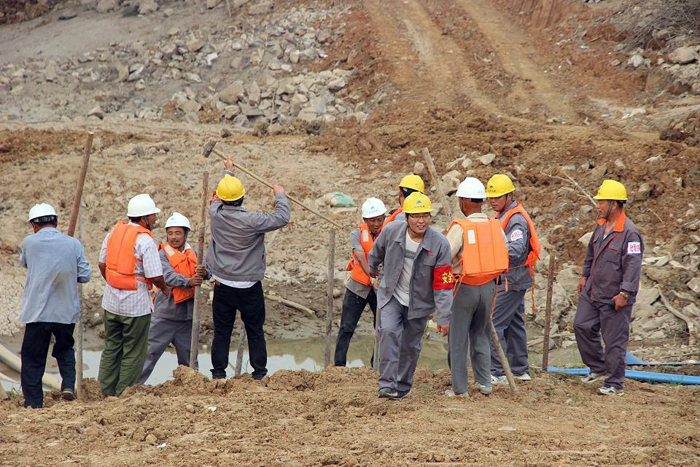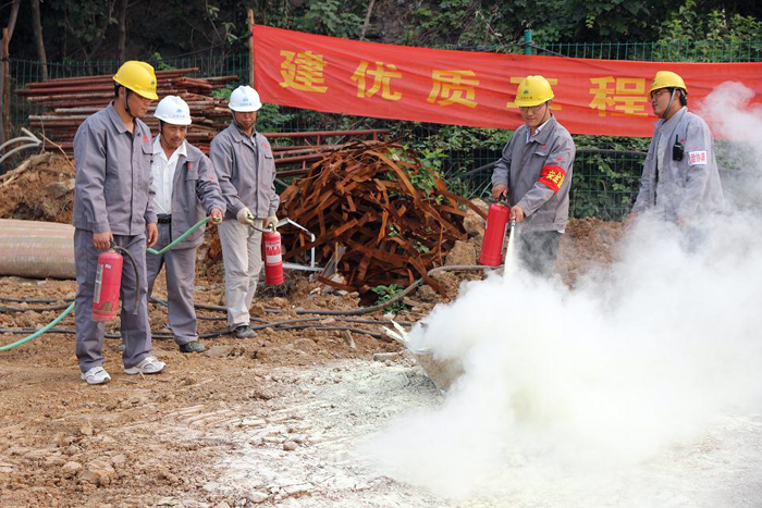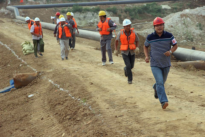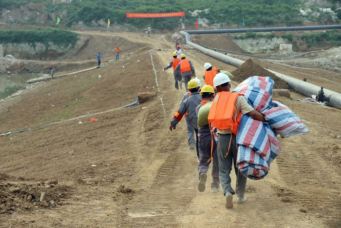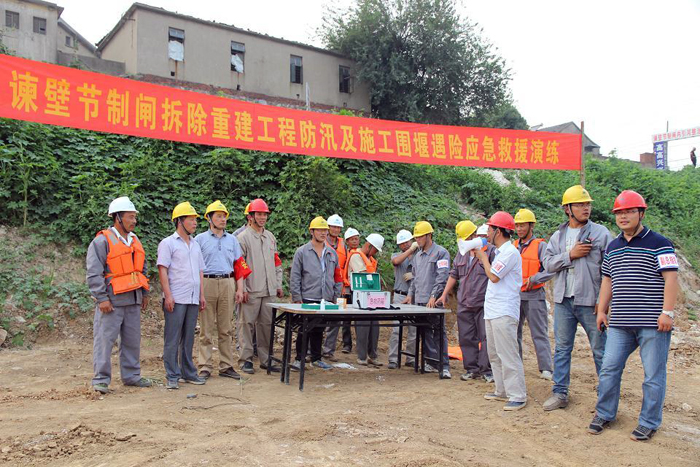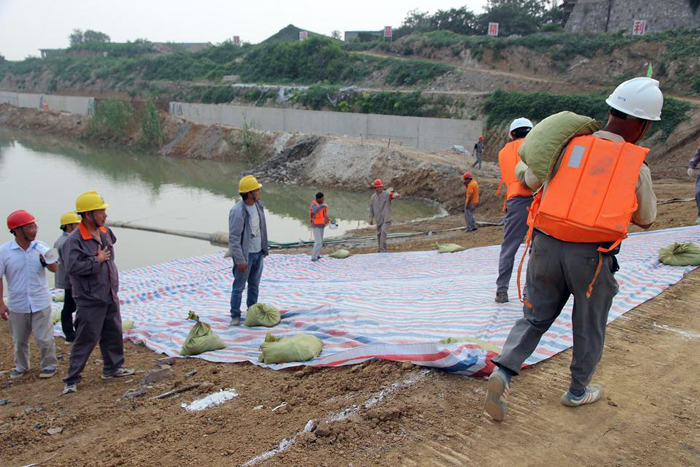 第一抢险小组队员将土装袋后人抬肩扛,源源不断地向堰顶运送加打子堰,阻挡即将漫过围堰的洪水;第二抢险小组迅速在围堰西南角迎水面铺设并压实彩条布阻塞管涌;第三抢险小组近十名抢险队员,奋不顾身地冲向发生滑坡险情的围堰背水坡面,打桩填土,对围堰滑坡面进行加固。装载机、挖掘机也挥动有力的臂膀向围堰上运土、抓土、填土,并进行碾压作业……此时,抢险现场的铁锤敲击声、机械轰鸣声和抢险队员们相互配合的号子声,汇成了一曲项目部全体员工众志成城、不畏艰险的团结战斗的乐章。