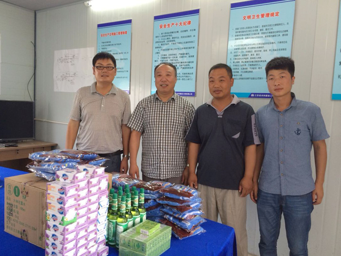 7月中旬以来,气温节节攀升,公司各项目施工现场地表温度更是超过40度。7月14日起,公司董事长、党委书记夏国春、公司党委副书记、工会主席姜启生、副总经理杨斌等党、政、工、团负责同志,走进公司的15个在建工程项目,看望炎热天气坚守施工一线的公司员工,为他们送上了风油精、花露水等防暑降温用品。