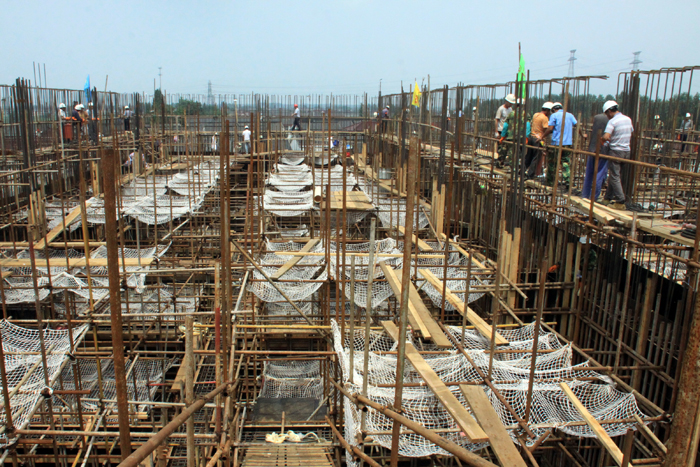继第一节沉井实施完成后,项目部立即进入了紧张的第二节制作施工。项目部精心组织,科学管理,带领全体员工顶住烈日和暴风雨的考验,迅速开展第二节沉井脚手架、模板和钢筋作业,确保如期具备大浇筑条件。
