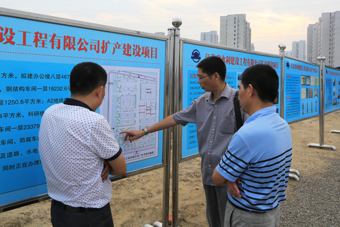 826下午,扬州市委书记谢正义来到我公司广陵产业园新基地建设工地,调研项目建设情况。谢书记指出,公司要抓住水利大投入的机遇,加快扩产项目的建设,扩大水利机械设备产业规模,做大做强企业。