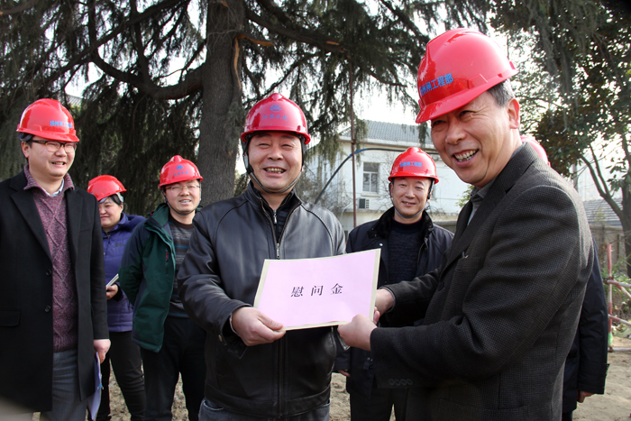 2月17日下午,扬州市委常委、宣传部长卢桂平一行来到扬州闸加固工程工地,慰问我公司一线施工人员。市水利局李春国局长、我公司时爱祥总经理等参加活动。