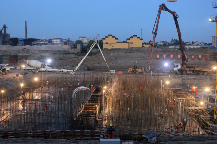 520,经过连续15小时施工,新沟河遥观南枢纽工程顺利完成了泵站底板混凝土浇筑,标志着工程施工进入了全面实施阶段。