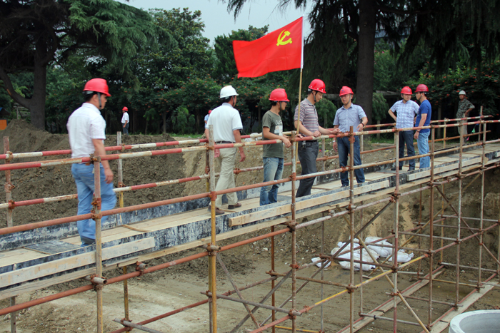 在建党94周年之际,第一工程分公司党支部书记顾明如、第三工程分公司党支部书记杨斌组织支部党员、积极分子,来到扬州闸加固工程工地,联合开展党建工作,举行学习交流活动。
