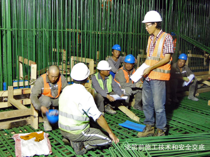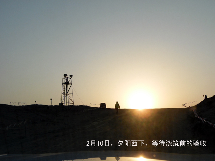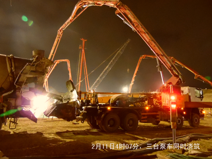 210,大年初三,沙特吉赞施工现场一片繁忙和紧张景象。经过项目部全体员工的努力,过滤站第一块底板的钢筋绑扎和模板在深夜1135分通过了验收,随后三台泵车到位进行混凝土浇筑,11日中午13时浇筑完成。总方量920立方米。