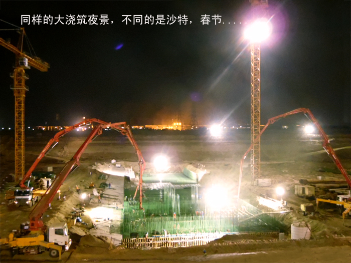 【编者按】2016年春节,在国内合家欢聚共庆佳节之时,沙特吉赞项目部的同志们依然在为浇筑忙碌着。据了解,他们仅在大年三十的晚餐多加了几道菜,以饮料代酒,互致新年祝福。而此时,国内时间已是正月初一的凌晨时刻了。在此,我们向沙特项目部的弟兄们致敬,你们辛苦了,过年好,祝一切顺利、吉祥。