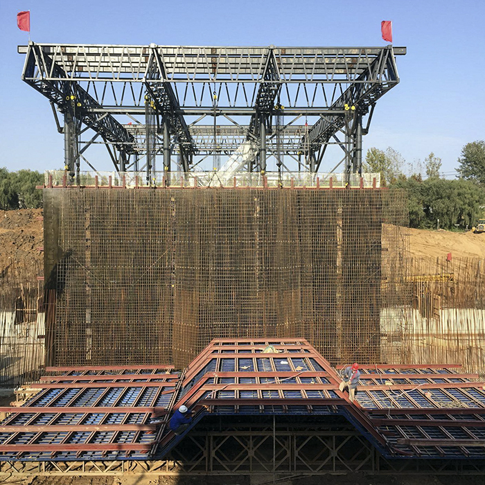 船闸闸室采用钢筋混凝土坞式结构,共分为10个结构段,每段长度均为20m。为保证闸室墙体表面的平整光洁和整体美观,减少闸室墙体的冷缝和螺栓孔的修补,闸室墙墙身及贴角迎水面采用整体大钢模浇筑成型。墙体两侧结构形式一样,单侧混凝土400m3模板支撑及吊装系统采用大型跨闸室可移动龙门支架,龙门支架兼作整块模板的运输、拼装、拆卸。该施工工艺为我公司在船闸工程施工中首次采用,目前已顺利完成第1节闸室墙的施工,施工质量满足规范要求。