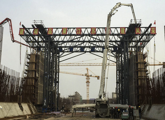 该工程采用的是交通项目的规范和标准,与常规水利工程施工不尽相同。工程开工以来,项目部边学习边施工,严格按水运规范控制工程安全和质量。同时,针对工程特点,开展了多个技术创新活动,先后开展了快易收口网、移动模架及整体组合大模板、方钢轨道控制大面混凝土平整度、冬季热水拌合混凝土等施工工艺应用和创新。