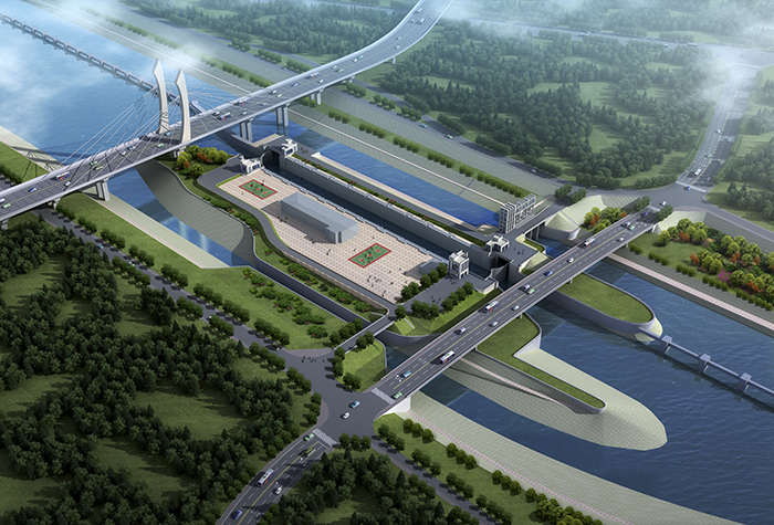 沱浍河航道五河新建船闸工程主要包括拆除原15孔分洪闸,新建船闸一座,重建3孔分洪闸和闸间连接墙及生态护坡等。新建船闸按Ⅳ航道设计,通航吨级为500t,闸室净宽23.0m,长200m。上下闸首采用三角门,分别设2扇输水洞平板钢闸门;分洪闸单孔净宽7 m,潜孔式平面钢闸门和检修叠梁门。