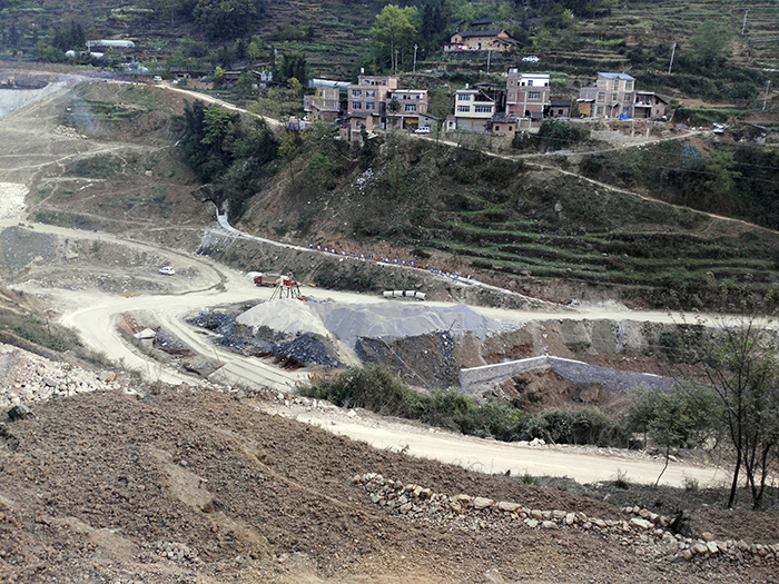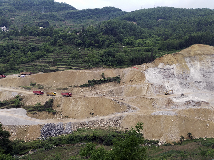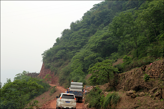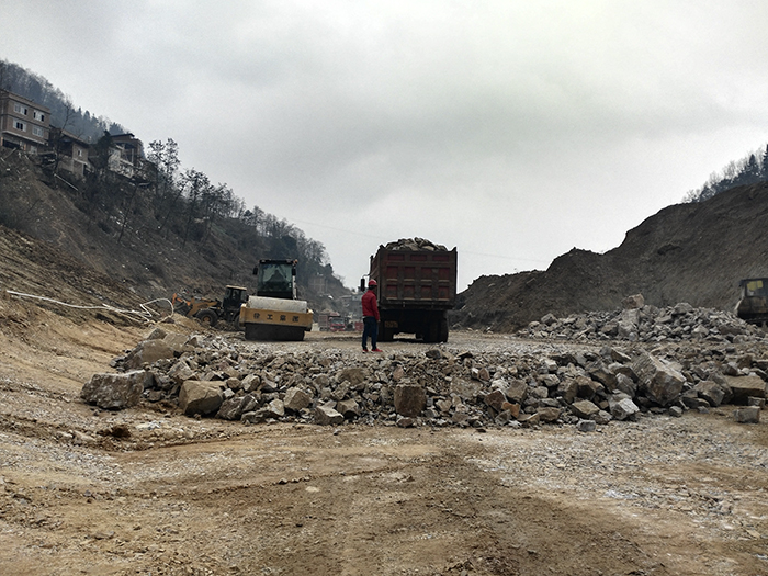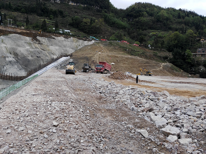 我公司项目部人员在开始大坝填筑后,遇到的第一个难题是料场山高无路,第一件事就是开山造路,在山坡上开辟出数条能够供渣土车通行的库区道路,以便运料车辆通行。