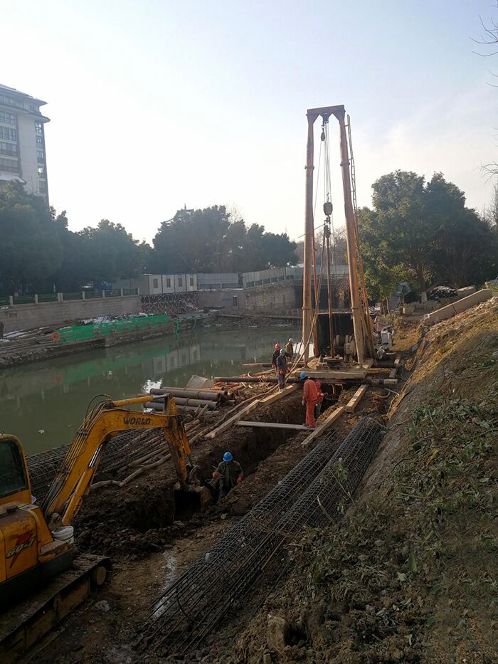 该工程位于常州市天宁区洋桥与水门桥之间,施工场地狭窄,施工限制多、难度大、工期紧。项目部于120日进场筹备,目前围挡封闭已基本完成,东西岸邻水侧施工平台已基本铺设完毕,上下游围堰已建成。