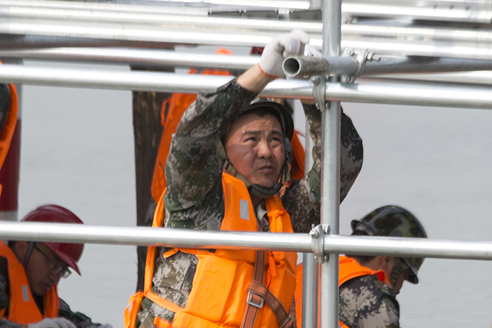 公司的参演队员均来自扬州市重点工程瓜洲泵站工地,技术熟练,业务精湛。他们用不到30分钟的时间,迅速搭起了组合坝的脚手支撑系统,成功封堵了溃坝决口。下面是他们演练过程的精彩回放: