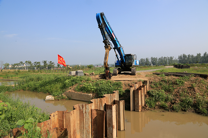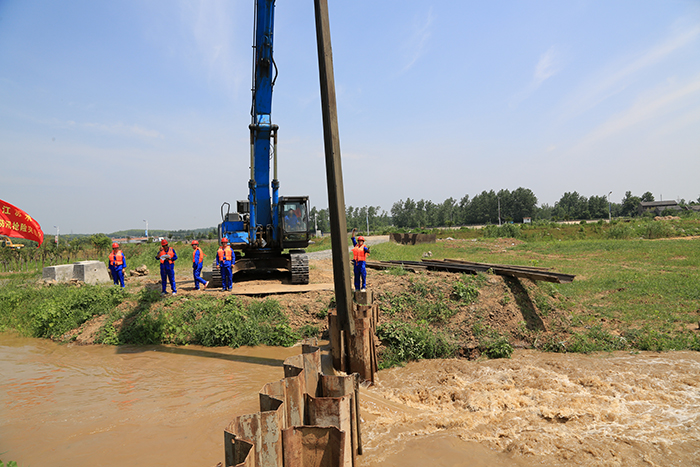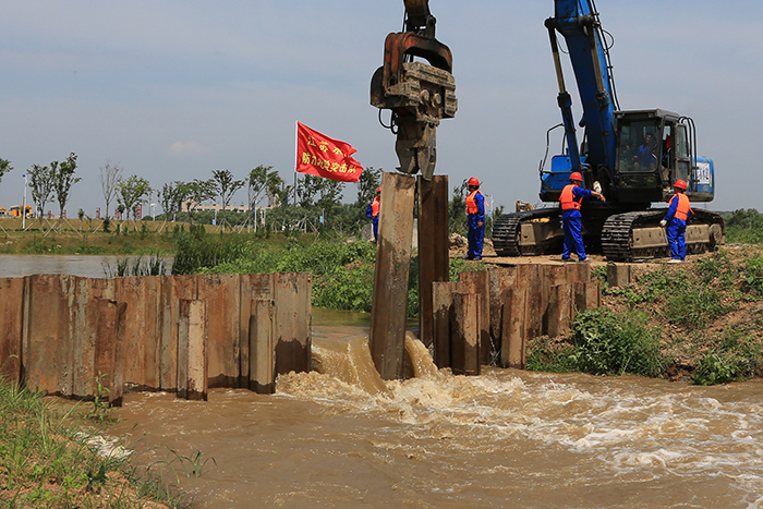 汹涌的水流冲破堤坝直泄而来,虽然是演习预设场景,但水流的冲击力不亚于真实的决堤抢险。公司的队员立即行动起来,植桩机拉起钢板桩,随着一阵阵锤击声,钢板桩迅速插向决口,决口逐渐缩小。十多分钟后,一道坚固的钢板桩围堰拦阻住了肆虐的水流,决口封堵取得了圆满的成功。