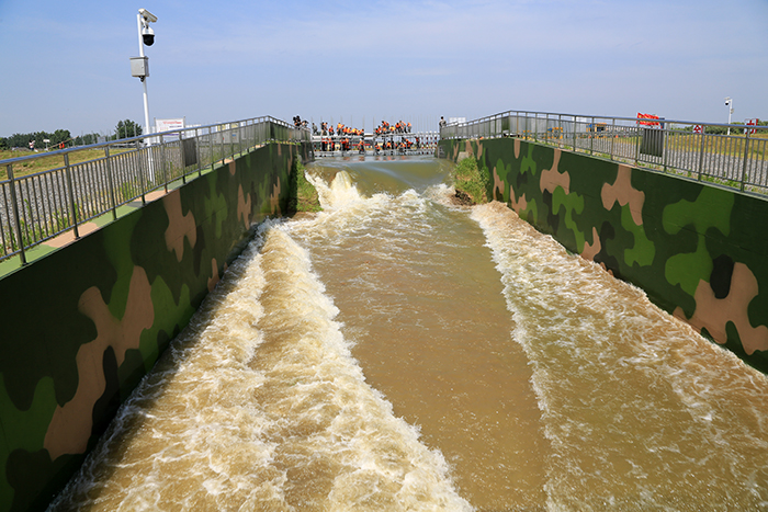 9时50分,指挥部接报,下游发生溃坝险情,指挥部立即下令搭建钢木石土石坝封堵决口,同时命令江苏水建防汛抢险突击队立即开展大型钢板桩植桩封堵作业。