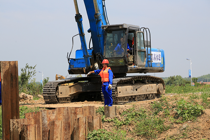 公司此次参加演练的科目是组织大型钢板桩封堵决口课目演示。我公司是省级防汛抗旱物资委储单位,储备了一批钢管、钢板桩。参加演练首先检验的是我公司对委储物资的调运协调能力。23日,在设备租赁分公司的支持下,30余吨钢板桩和植桩机等大型机械,按照《防汛物资紧急调运预案》在规定时间内到达演练指定位置,并进行了预演施工。