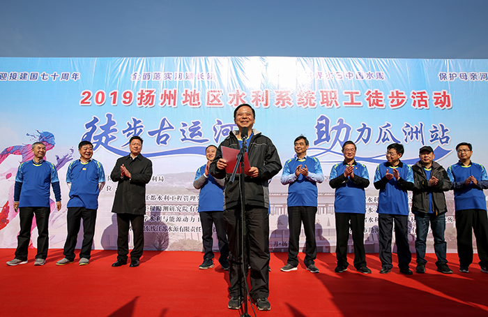 上午8时30分,扬州市水利局人事处处长季暑月主持了开幕式,我公司董事长时爱祥在开幕式上致辞,扬州市水利局局长康盛君致辞并宣布活动开始。参加活动的有从事水行政管理的,有从事水利工程管理的,有从事水文水资源管理的,有从事水利高等教育的,而更多的是来自水利工程勘测、设计、施工一线的职工和志愿者们,可以说是扬州水利历史上第一次大家庭聚会,是扬州市域水利工作者携手同行,向建国70周年献礼的一个盛会,更是全面落实河湖长制、纪念2019年世界水日、中国水周、保护母亲河、推进重点水利工程建设的一次“新长征”。