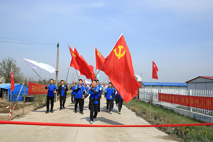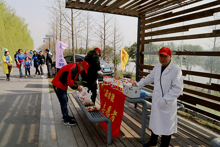 早春的阳光和煦明媚,瓜洲泵站工地上处处生机盎然。公司驾驶员带领、指引接送徒步人员的车辆统一、有序停放于项目部篮球场;公司志愿者们分工明确,有的早早到达中途补给站,精心准备了水、巧克力等物资,以供徒步人员能量补给;有的提前至终点准备好水、食品、纪念证书等迎接徒步大军;瓜洲项目医护人员提前准备了葡萄糖和急救用品,保障徒步活动顺利进行。