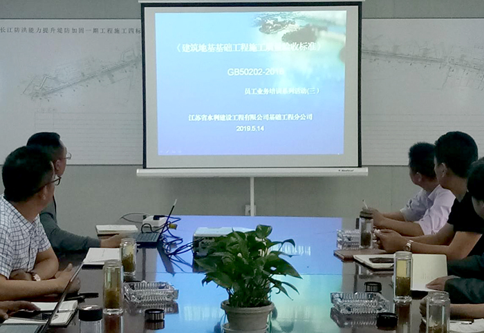 514日下午2时,基础工程分公司在扬州市长江防洪能力提升加固一期工程(江都区)施工Ⅳ~Ⅴ标项目部举办了《建筑地基基础工程施工质量验收标准》(GB50202-2018)培训,分公司领导、部门负责人及工程技术人员20多人参加了培训。