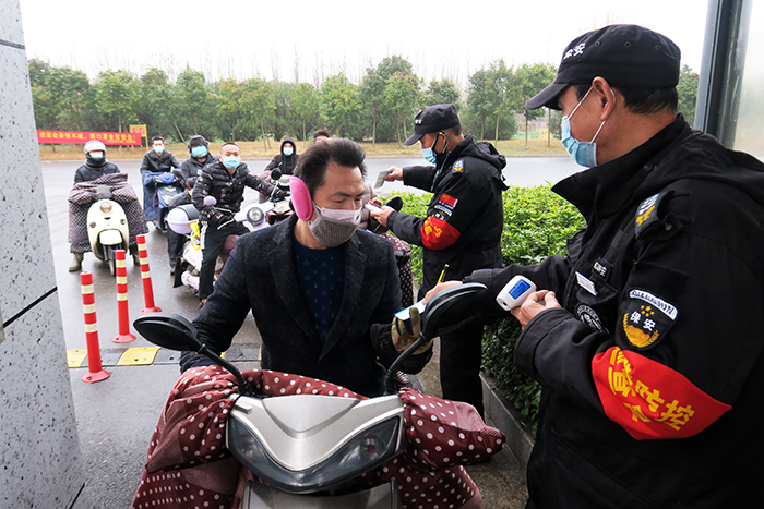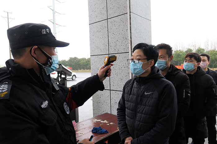 214日清晨730分,浓浓的雾气尚未散去,江苏水利机械制造公司的员工已经戴着口罩在大门口列队,测量体温,登记卡片,陆续进入厂区,开始了一天紧张的工作。