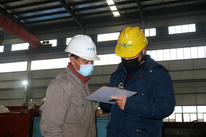 江苏水机公司作为江苏省水利工程钢闸门、启闭机制造骨干企业,往年正月初四开工已成为企业惯例。开展防控新冠肺炎疫情以来,如何稳产复工,确保重点水利工程钢结构生产任务不受疫情影响,成为摆在水机公司领导面前的一道难题。他们知道,当前必须将疫情防控作为压倒一切的重要政治任务,只有把各项防控措施落实到位才能有序组织复工。大年初七,水机公司就开始周密部署疫情防控工作,多措并举,抓好疫情防控和复工稳产两手工作
