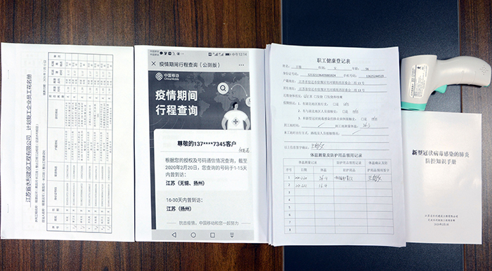 人员管控到位。项目部下发通知,要求重点疫区人员、假期内与重点疫区人员、确诊、疑似患者有接触史的人员暂缓回工地。对已进场员工按照一人一表标准制作职工健康登记表,做好员工基本信息、假期出行情况、身体状况、体温测量监测。进场人员无特殊情况不得外出,避免交叉感染。