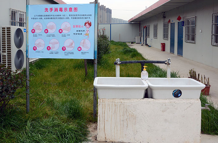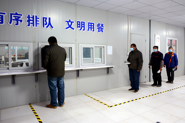 日常管理到位。项目部在生活区和施工现场大门设置测温点,安排管理人员值班,所有人员每天两次到测温点进行测温,体温正常方可进入施工现场工作。项目部安排保洁人员每天至少两次对办公区、生活区进行消毒并填写消毒记录表,对食堂、浴室、卫生间等人员密集场所要求每天消毒次数不少于4次。项目部还实行分批就餐,有效避免就餐人员集中,减少交叉感染的风险。