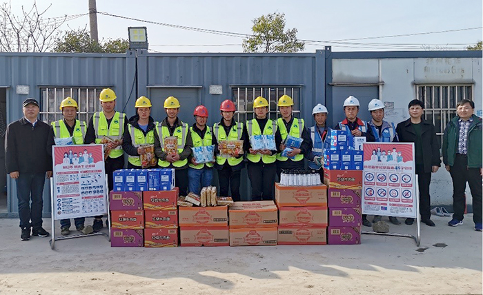 42日下午,公司总经理顾明如、公司副总经理、党委副书记、工会主席姜启生带队慰问了仪征泗源沟节制闸除险加固工程项目部,为在疫情期间连续抢工的一线工人送去防疫物资以及方便食品。