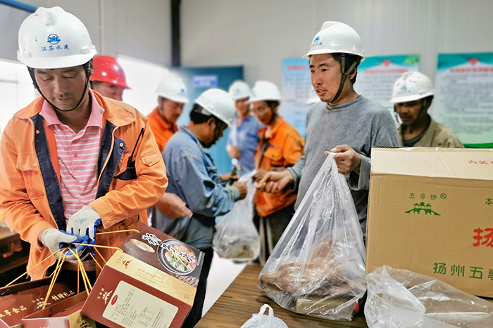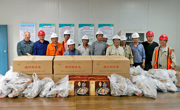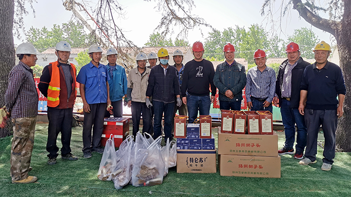 从年后复工至今,公司多个项目一直处于紧张忙碌的抢工之中,向着“530”重大节点目标迈进。为鼓舞士气,加强项目建设过程中的安全监督工作,公司工会在“五一”前后深入项目一线指导工作、慰问员工。公司党委副书记、副总经理、工会主席姜启生带队,分别来到定波水利枢纽工程,以及新孟河流域的界牌枢纽工程、常州新北区河道施工III标、北干河施工II标,宿迁船行灌区施工3标等项目,为复工以来一直坚守工作岗位的项目管理人员、工友们送去亲切的关怀和诚挚的慰问,牛奶、八宝粥、狮子头、盐水鹅等富有扬州特色的慰问品,让他们在奋力抢工之余能够品尝到“家”的味道、感受到的温暖。