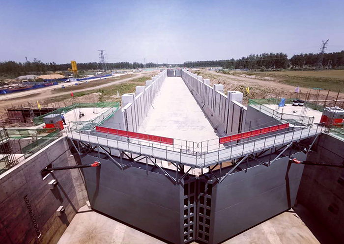 陆运河船闸工程于2017年6月18日正式开工,12月1日完成第一节闸室底板浇筑,2020年4月25日完成闸室及上下闸首所有二期砼浇筑,5月13日完成闸门及启闭机安装调试,5月15日完成征地范围内水下工程,具备水下已完工程质量鉴定条件。