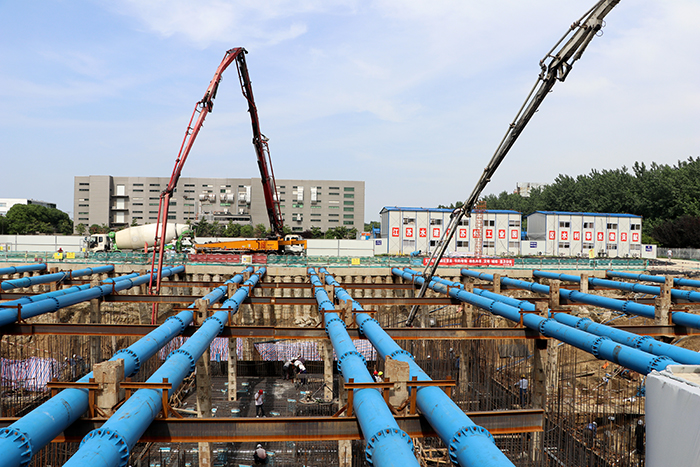 泵站底板作为本项目首次且体量最大的混凝土浇筑,项目部精心策划,提前召开了施工方案讨论会,分析技术难点,做好预防大体积混凝土裂缝控制措施,合理安排任务;加强对作业人员技术和安全交底,全面规范管理;克服场地狭窄、交通运距长、大体积混凝土施工等施工难点,多举措确保完成本次混凝土浇筑。
