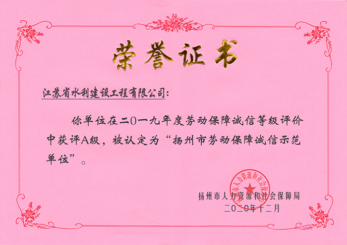近日,经扬州市人力资源和社会保障局考核评定,公司被授予“2019年度劳动保障诚信示范单位”。
