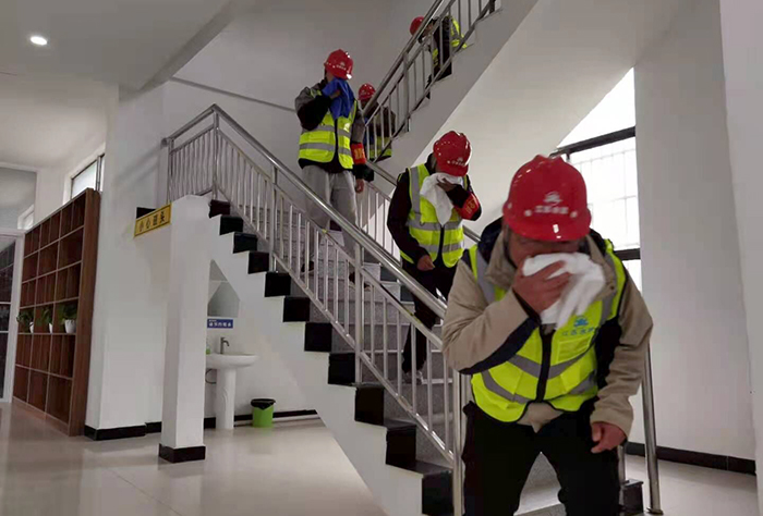 演练正式开始之前,项目副经理作了动员讲话,安全负责人向大家讲解并示范了常用手提式干粉灭火器的使用方法、使用距离、使用角度以及使用站位,并现场示范了一旦发生火情,个人应如何自救和互助,如何疏散及逃生,如何最大限度减少事故伤害和损失。