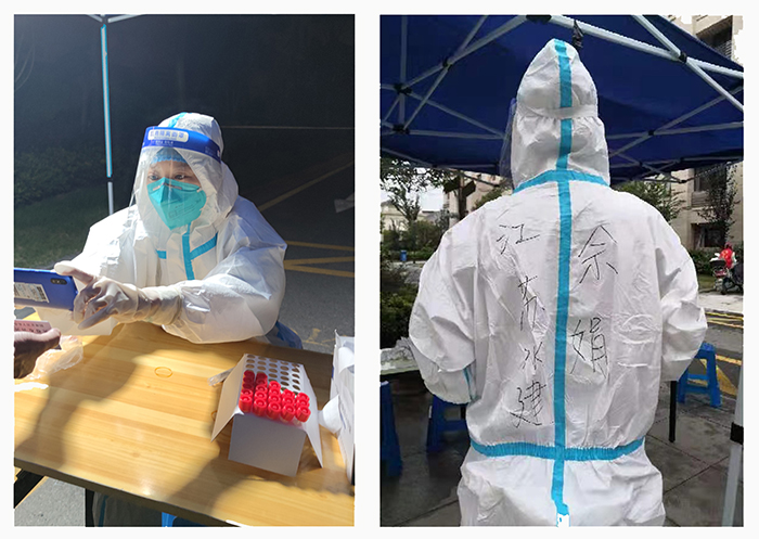 一分公司佘娟同志,疫情期间负责小区核酸检测信息采集志愿服务。她穿着密不透风的防护服,认真细致地完成每次采集任务。汗水浸湿的衣衫和脸上深深的口罩勒痕展现了江苏水建青年员工“不负青春,冲锋在前”的使命担当。