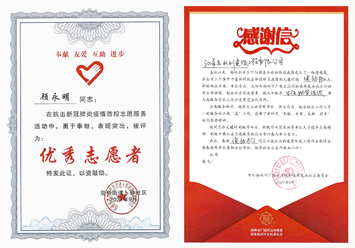 一身身志愿红展现了江苏水建人不怕苦不怕累、无私奉献的身影,一封封感谢信诠释了新时代奉献、友爱、互助、进步的志愿者精神,一本本鲜红的荣誉证书谱写了一曲众志成城、同心抗的完美篇章。