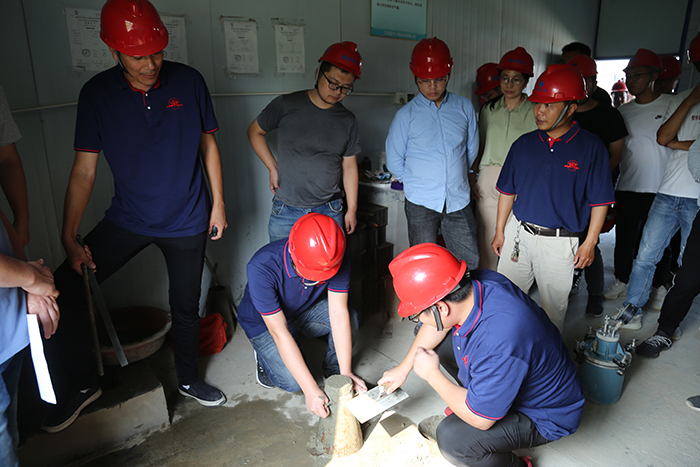 此次活动有质量理论培训和现场试验实操两部分。上午,常州分公司总工程师韦广国、公司总工办主任罗圣海分别与大家讲解、交流了《水利工程施工过程中常规试验》、《水利工程钢筋施工质量控制》;下午,参培人员在项目部试验室进行了混凝土坍落度、含气量、混凝土试件试压、砂筛分、土工环刀试验等现场实操,韦广国从具体操作规程、试验过程中注意事项等方面对每个实操试验项目进行了详细讲解和过程指导。